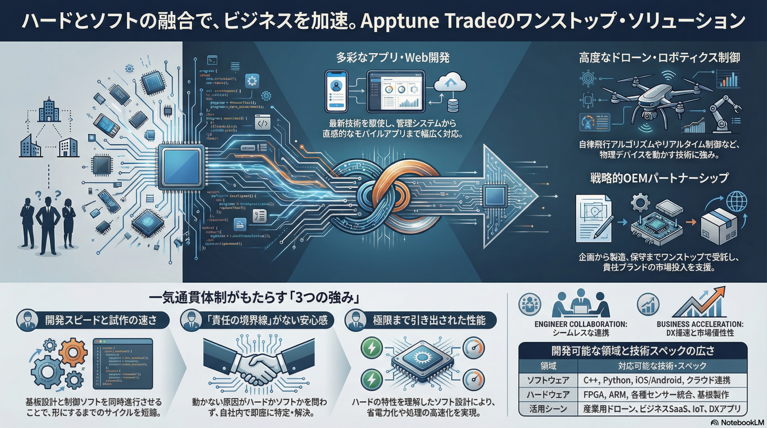 APPTUNE TRADEは、モバイルアプリ/Webシステムから、ドローン・ロボティクス等の高度制御、戦略的OEM供給までを一気通貫で担います。